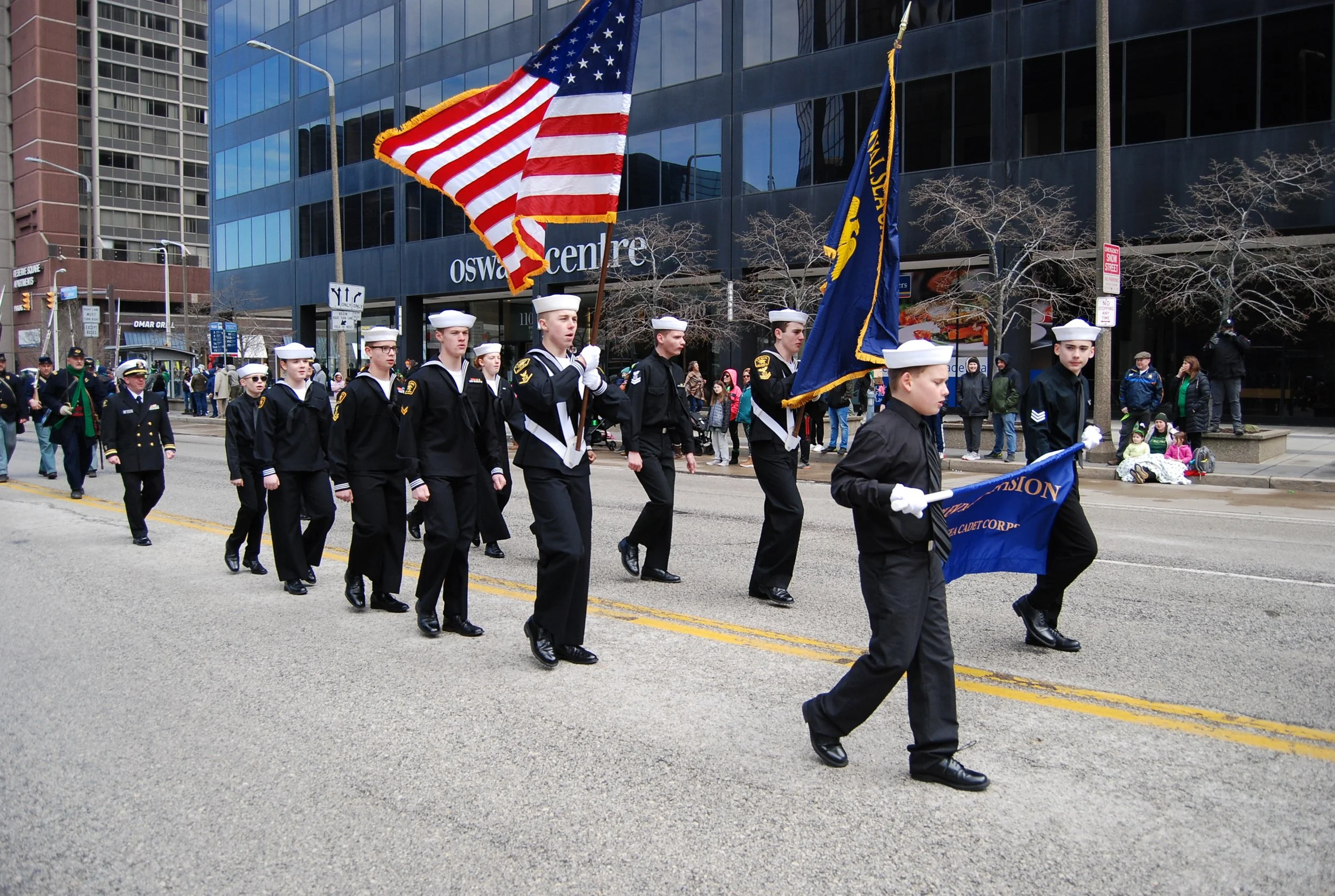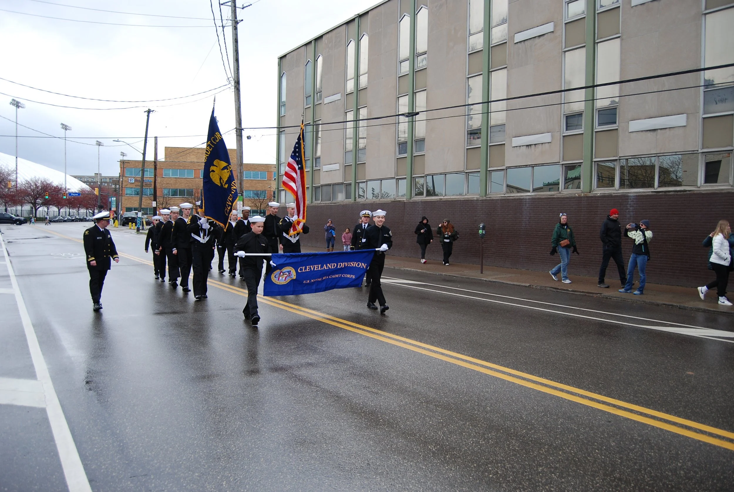 Uniformed Cleveland Grays members joined the Cleveland Division of the Naval Sea Cadet Corps to march in the 2024 St. Patrick’s Day Parade in Downtown Cleveland.
